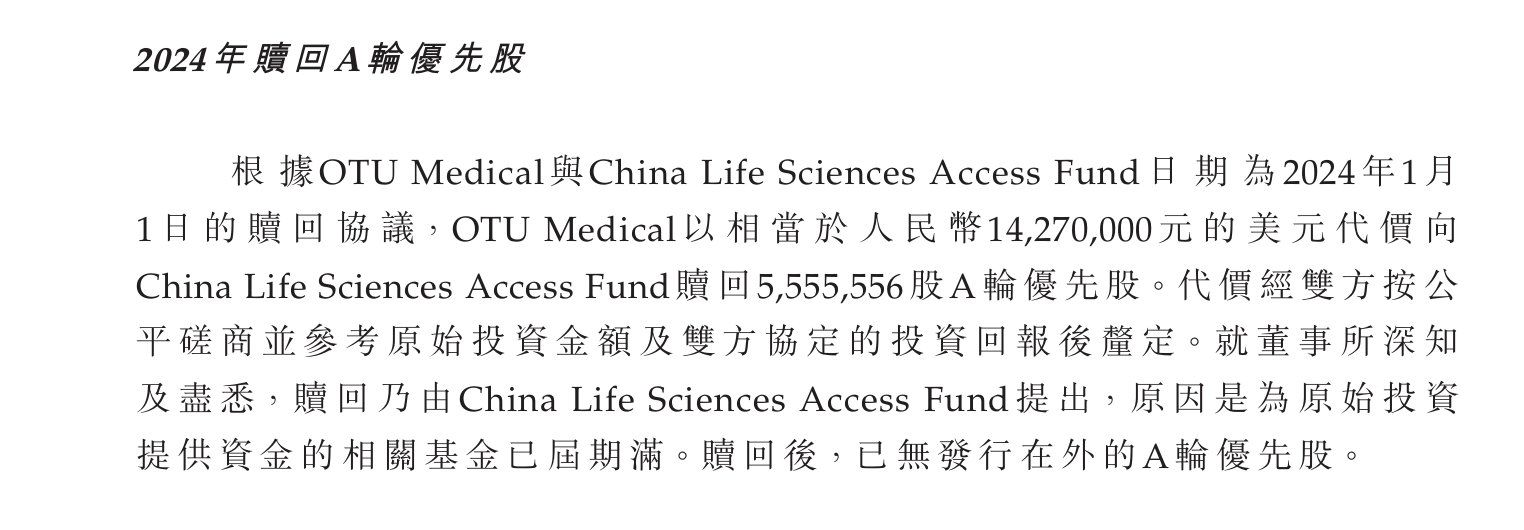 但在2024年和2025年,OTU Medicalf分别回购了China Life Science、Guo Ying所持股份,对价分别为1427万元人民币、5400美元,两家投资机构就此退出股东行列。