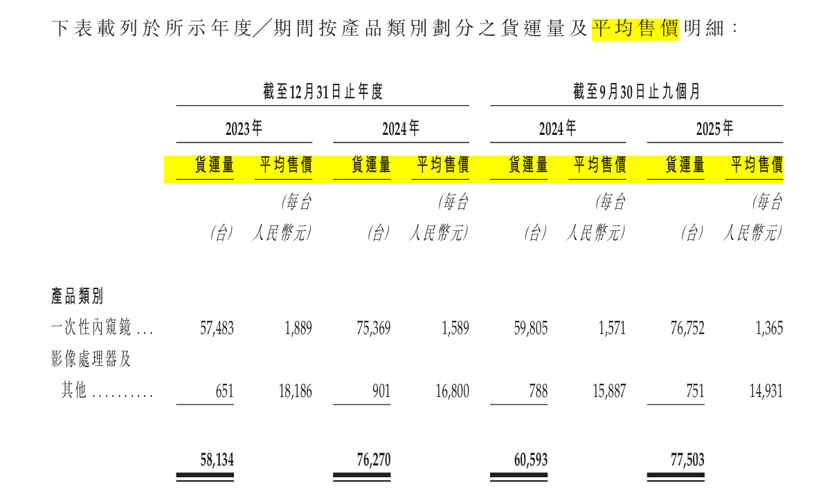 然而,出货量的增长并未带来相应的利润释放——核心产品一次性内窥镜的平均售价从2023年的1889元/台,降至2024年的1589元/台,并在2025年前三季度进一步跌至1365元/台,跌幅超过27%。影像处理器等配套产品单价也同步下滑。