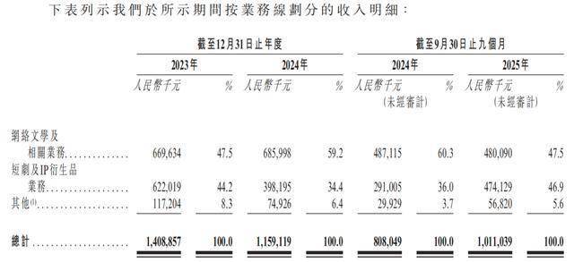 2023年-2024年及2025年1-9月(简称:报告期),中文在线来自网络文学及相关业务的收入分别为6.69亿元、6.86亿元、4.80亿元,占总收入的47.5%、59.2%、47.5%。