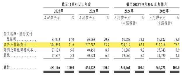 高额的销售及营销费用是吞噬净利润的主要原因,2025年1-9月公司销售及营销费用高达6.6亿元,同比增长94%。其中,广告及营销费用5.17亿元,同比大增125.76%。