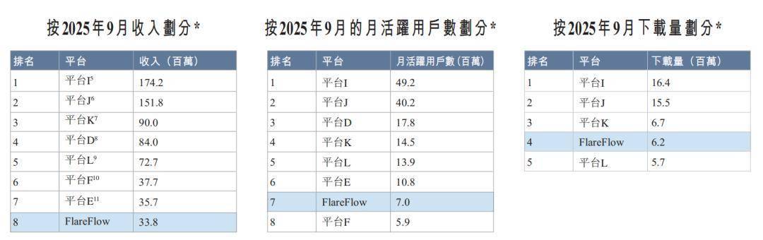 目前,FlareFlow作为海外运营重点,2025年4月推出以来,在200多个国和地区,实现注册用户突破3300万,曾登顶美国区免费娱乐应用日榜,上线首七月月活用户位列第二。按2025年9月的收入、月活跃用户数、下载量,FlareFlow于海外短剧平台的排名分别居第8、第7、第4。
