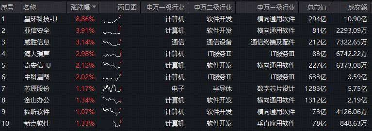 成份股方面,星环科技-U领涨超8%,亚信安全、威胜信息涨逾3%,海天瑞声、奇安信-U、中科星图、芯原股份、金山办公等个股跟涨。