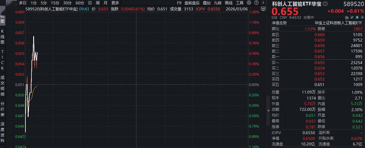 盘面上,周五(3月6日)重点布局国产AI产业链的科创人工智能ETF(589520)逆市活跃,场内涨幅盘中摸高0.92%,现涨0.61%。