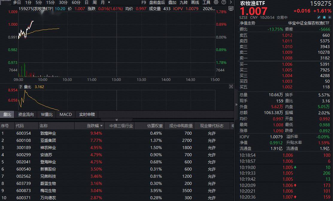 农牧渔板块今日(3月6日)再度猛攻!全市场唯一农牧渔ETF(159275)开盘后迅速拉升,截至发稿,场内价格大涨1.61%。