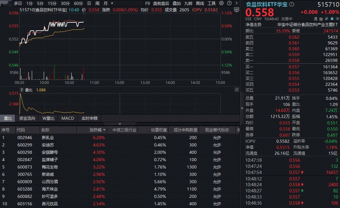 成份股方面,大众品涨幅居前,部分白酒龙头亦表现亮眼。截至发稿,新乳业大涨超6%,安迪苏、安琪酵母、盐津铺子涨超4%,山西汾酒、泸州老窖、洋河股份等亦涨幅居前。