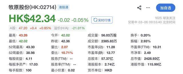 牧原股份于2026年2月6日登陆港交所。截至发稿,其每股报42.34港元,较IPO发行价(每股39港元)上涨8.56%,目前总市值约2428.93亿港元。