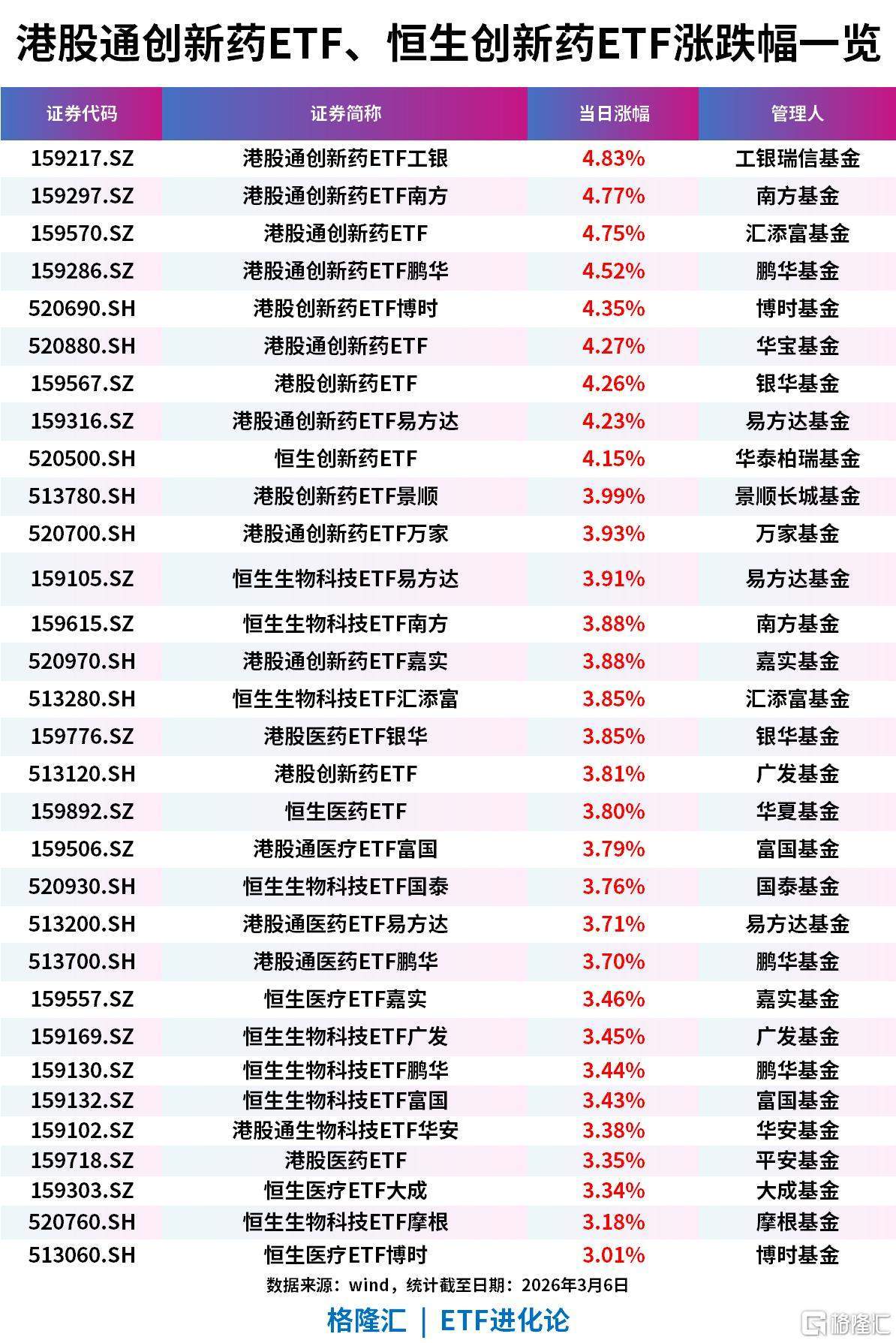 创新药板块强势上涨,港股通创新药ETF工银、港股通创新药ETF南方、港股通创新药ETF、港股通创新药ETF鹏华、港股创新药ETF博时、港股通创新药ETF、港股创新药ETF、港股通创新药ETF易方达、恒生创新药ETF涨超4%;港股创新药ETF景顺、港股通创新药ETF万家、恒生生物科技ETF易方达、恒生生物科技ETF南方、港股通创新药ETF嘉实、恒生生物科技ETF汇添富、港股医药ETF银华、港股创新药ETF、恒生医药ETF、港股通医疗ETF富国、恒生生物科技ETF国泰、港股通医药ETF易方达、港股通医药ETF鹏华、恒生医疗ETF嘉实、恒生生物科技ETF广发、恒生生物科技ETF鹏华、恒生生物科技ETF富国、港股通生物科技ETF华安、港股医药ETF、恒生医疗ETF大成、恒生生物科技ETF摩根、恒生医疗ETF博时涨超3%。