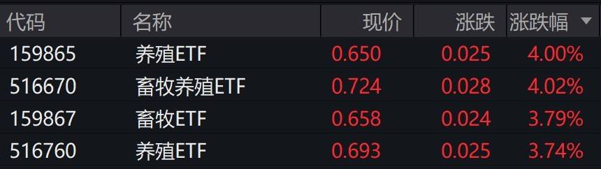 养殖概念股走强,梅花生物、立华股份涨超6%,牧原股份、海大集团涨超5%。