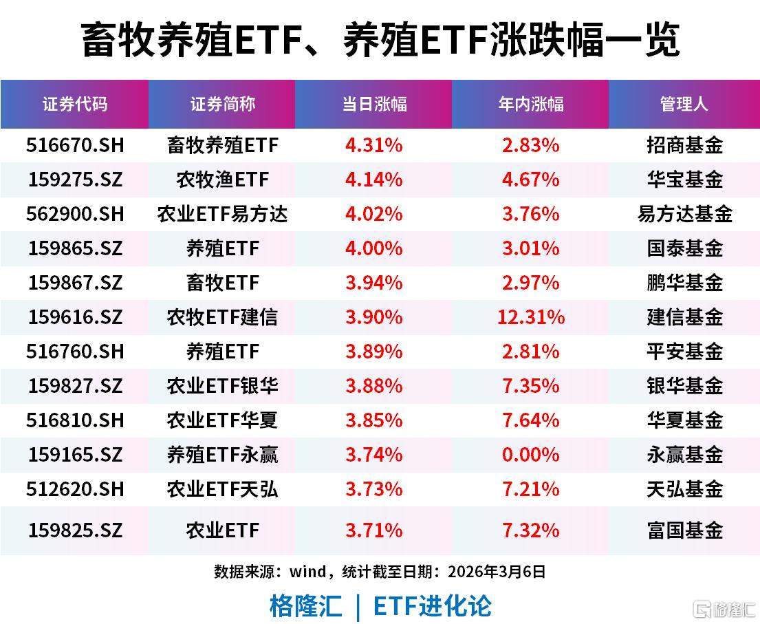 畜牧养殖ETF、农牧渔ETF、农业ETF易方达、养殖ETF涨超4%;畜牧ETF、农牧ETF建信、养殖ETF、农业ETF银华、农业ETF华夏、养殖ETF永赢、农业ETF天弘、农业ETF涨超3%。