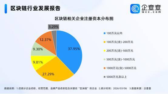 企查查数据显示,从注册资本分布来看,区块链相关企业多为轻量级企业,注册资本在200万元以下的相关企业占比超六成,其中注册资本在100万元以内的相关企业占比37.95%,在100万元(含)-200万元的相关企业占比27.29%。千万级以上的企业合计占比15.66%。