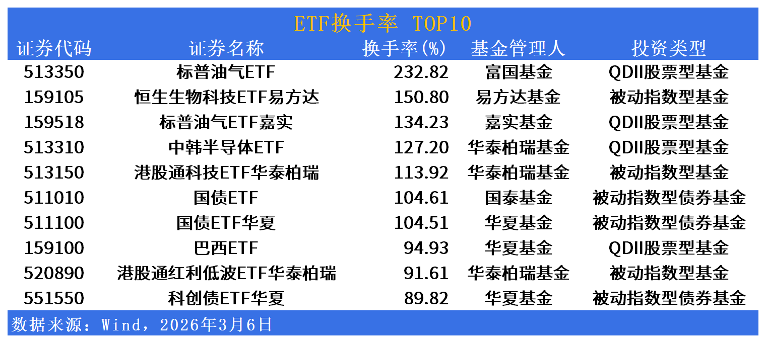换手率维度,富国标普油气ETF(513350)换手率232.82%居首,易方达恒生生物科技ETF(159105)换手率150.80%,嘉实标普油气ETF(159518)换手率134.23%,华泰柏瑞中韩半导体ETF(513310)换手率127.20%,跨境QDII与债券型产品流动性维持高位。