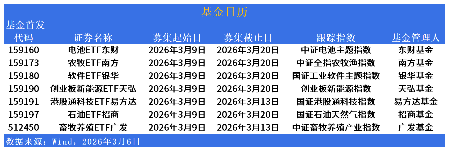 东财电池ETF(159160)将于3月9日至20日募集,跟踪中证电池主题指数(931719),选取动力电池、储能电池、消费电子电池及材料设备领域公司,自由流通市值加权,单个样本权重上限10%;南方农牧ETF(159173)同期募集,跟踪中证全指农牧渔指数(H30195),覆盖农林牧渔全产业链;银华软件ETF(159180)跟踪国证工业软件主题指数(980066),聚焦工业软件研发与应用企业;天弘创业板新能源ETF(159190)跟踪创业板新能源指数(399266),选取创业板新能源产业代表性公司;易方达港股通科技ETF(159191)将于3月9日至13日募集,跟踪国证港股通科技指数(987008),覆盖港股通科技龙头;招商石油ETF(159197)跟踪国证石油天然气指数(399248),涵盖油气勘探开采及服务销售企业;广发畜牧养殖ETF(512450)将于3月9日至13日募集,跟踪中证畜牧养殖产业指数(930707),选取饲料、养殖及加工环节上市公司。