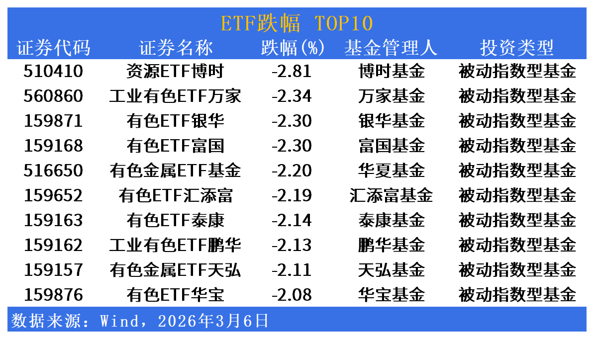 跌幅方面,周期板块显著承压,有色金属及资源类ETF跌幅居前