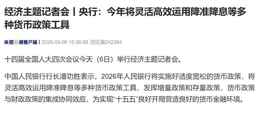中国人民银行行长潘功胜表示,2026年人民银行将实施好适度宽松的货币政策,将灵活高效运用降准降息等多种货币政策工具,发挥增量政策和存量政策,货币政策与财政政策的集成协同效应,为实现“十五五”良好开局营造良好的货币金融环境。