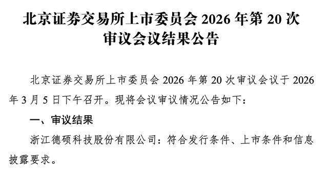 瑞财经 吴文婷3月5日,浙江德硕科技股份有限公司(以下简称“德硕科技”)北交所IPO过会,保荐机构为国泰海通证券股份有限公司。