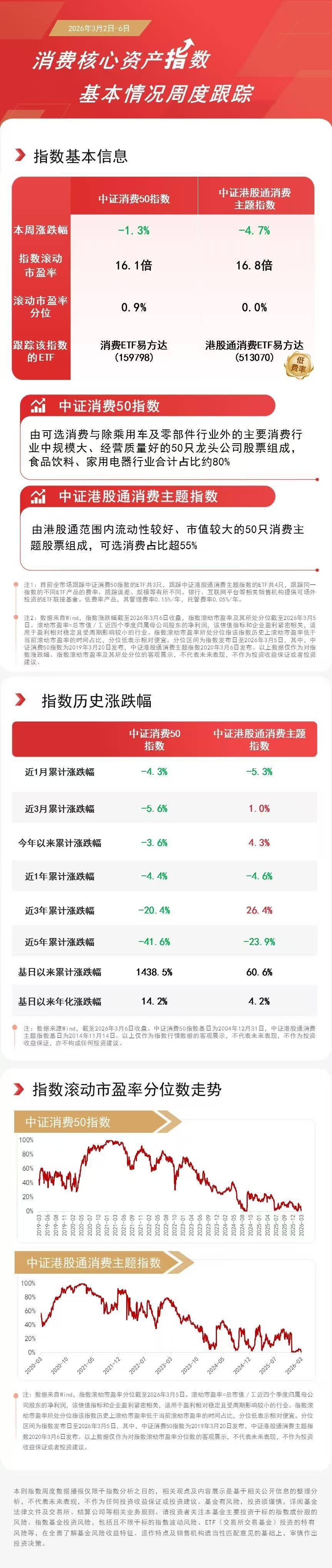 3月6日周五,消费板块在连续回调后迎来反弹,食品、居家用品等方向表现活跃,中证消费50指数、中证港股通消费主题指数分别上涨1.6%、2.4%,从周维度来看,中证消费50指数下跌1.3%,中证港股通消费主题指数下跌4.7%。