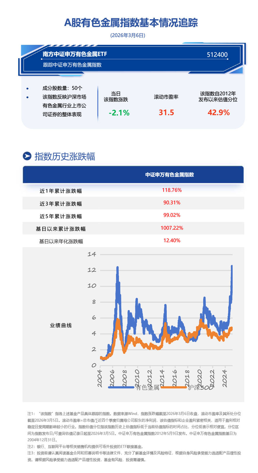 截至2026年3月6日收盘,有色金属ETF(512400)换手4.08%,成交15.95亿元,跟踪标的中证申万有色金属指数收跌2.1%。