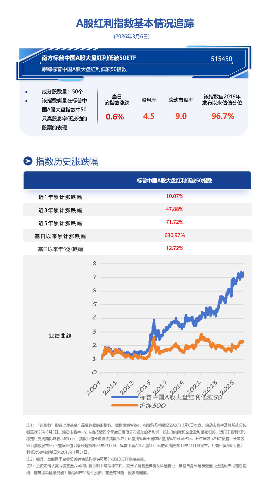 截至2026年3月6日收盘,红利低波50ETF(515450)成交1.30亿元,跟踪指数标普中国A股大盘红利低波50指数收涨0.6%。