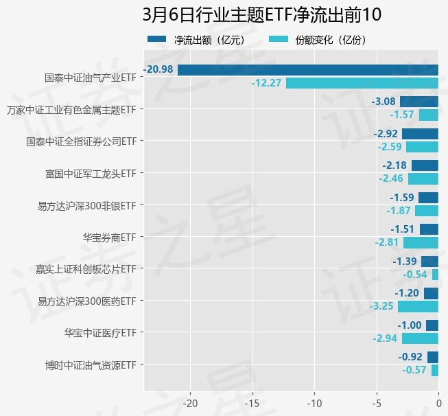 当日有141只行业主题ETF基金出现资金净流出,其中净流出排首位的是国泰中证油气产业ETF(561360),份额减少了12.27亿份,净流出额为20.98亿元。