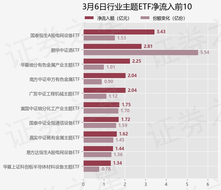 当日有95只行业主题ETF基金出现资金净流入,其中净流入排首位的是国泰恒生A股电网设备ETF(561380),份额增加了1.53亿份,净流入额为3.43亿元。