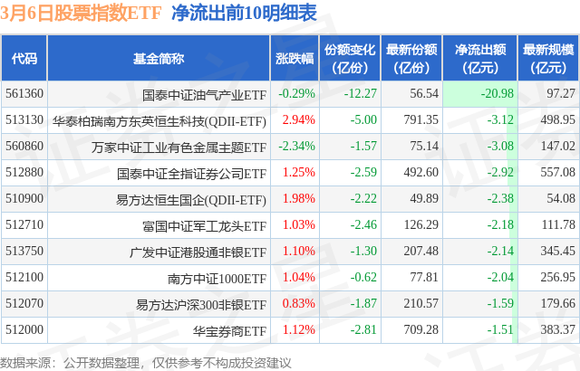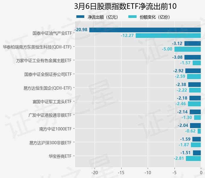 当日有232只股票指数ETF基金出现资金净流出,其中净流出排首位的是国泰中证油气产业ETF(561360),份额减少了12.27亿份,净流出额为20.98亿元。