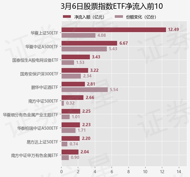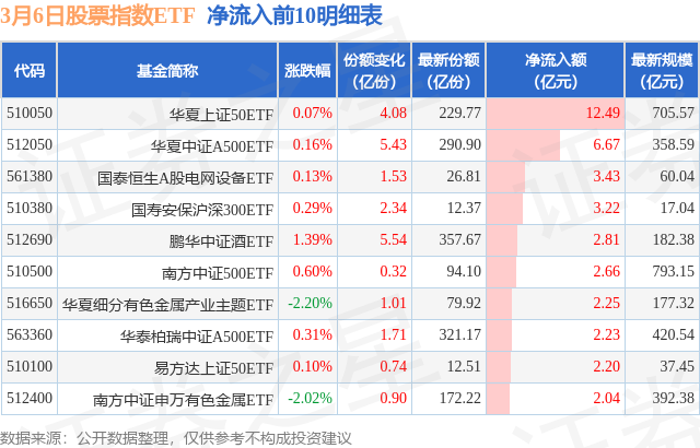 当日有162只股票指数ETF基金出现资金净流入,其中净流入排首位的是华夏上证50ETF(510050),份额增加了4.08亿份,净流入额为12.49亿元。