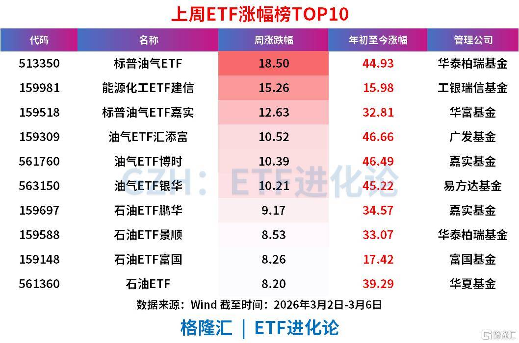 涨幅表现:标普油气ETF以18.50%的周涨幅位居榜首,能源化工ETF(工银瑞信)周涨15.26%,其余油气类ETF周涨幅也普遍在8%-13%区间。