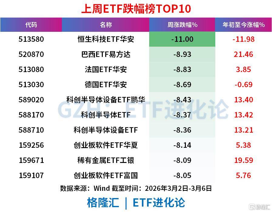 跨境ETF领跌:恒生科技ETF周跌幅达11.00%,年内累计下跌11.98%;巴西、法国、德国等海外市场ETF也出现8%-9%的跌幅,反映出全球市场波动和港股科技板块的调整压力。