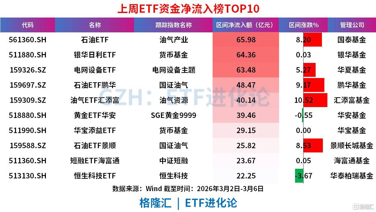 净流入主力:商品型ETF(石油、黄金)和货币型ETF是主要吸金板块,同时电网设备、恒生科技等主题ETF也获得资金青睐。