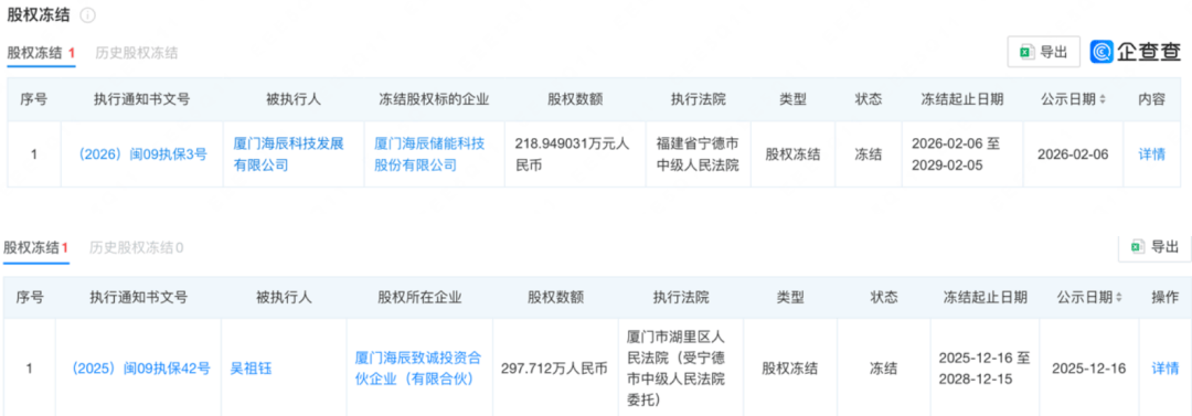 更复杂的是,这并非海辰储能面临的唯一的法律纠纷。过去一年,公司已经与行业龙头宁德时代多次陷入专利与不正当竞争纠纷,目前,海辰储能部分公司股权及创始人吴祖钰相关持股平台的部分股权已被司法冻结。