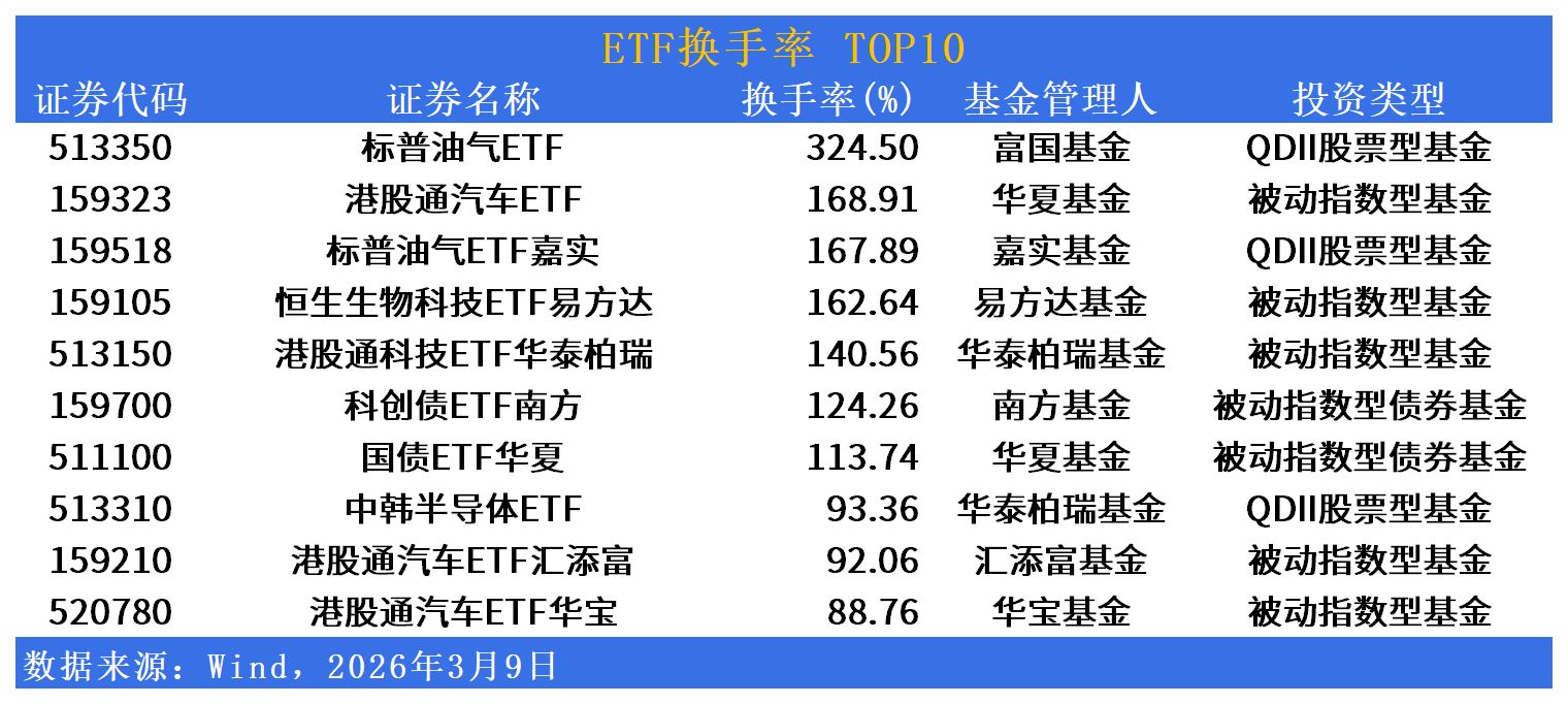 换手率方面,富国标普油气ETF(513350)换手率324.50%居首,华夏港股通汽车ETF(159323)换手率168.91%,嘉实标普油气ETF(159518)换手率167.89%,易方达恒生生物科技ETF(159105)换手率162.64%,华泰柏瑞港股通科技ETF(513150)换手率140.56%,跨境与债券品种交投高度活跃。