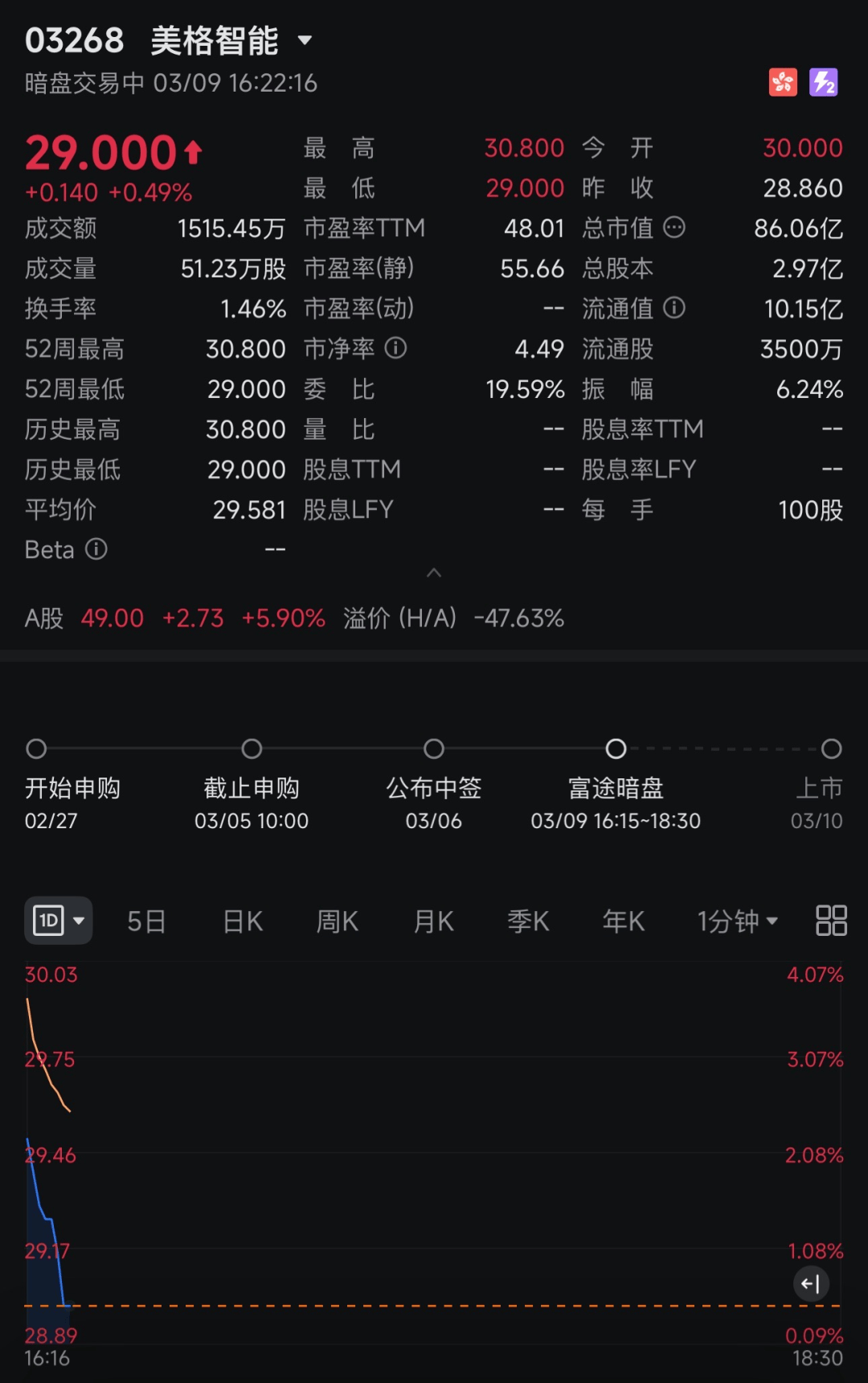 美格智能(03268)将于3月10日挂牌买卖。截止发稿,富途证券暗盘交易显示报价29港元,较招股价28.86港元上涨0.49%,每手100股,不计手续费,每手赚14港元。