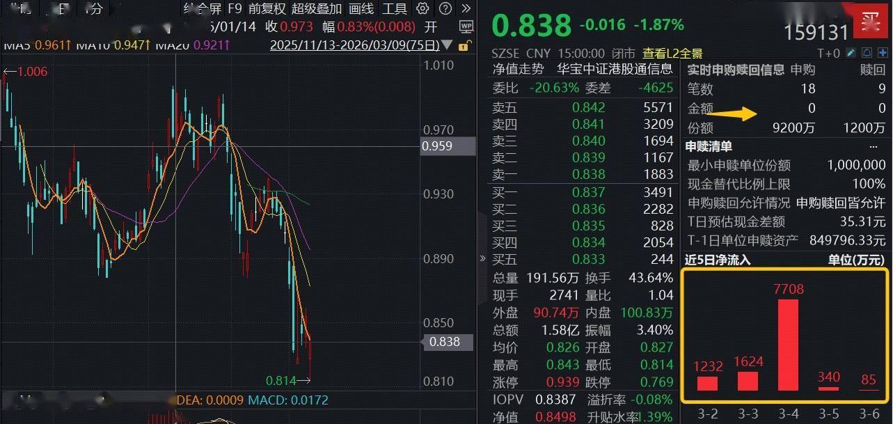 下跌方面,油价暴涨引发通胀预期,芯片等硬科技方向跌幅明显,全市场首只聚焦“港股芯片”产业链的港股信息技术ETF(159131)场内价格一度跌超4%,资金持续逢跌涌入,继此前5日连续“吸金”超1亿元,今日再获净申购8000万份。