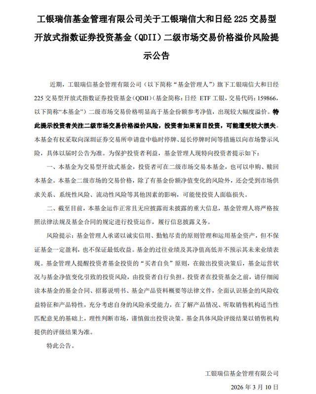 3月9日,工银瑞信基金管理有限公司公告,公司旗下工银瑞信大和日经225交易型开放式指数证券投资基金(QDII)(基金简称:日经ETF工银,交易代码:159866)二级市场交易价格明显高于基金份额参考净值,出现较大幅度溢价。特此提示投资者关注二级市场交易价格溢价风险,投资者如果盲目投资,可能遭受较大损失。