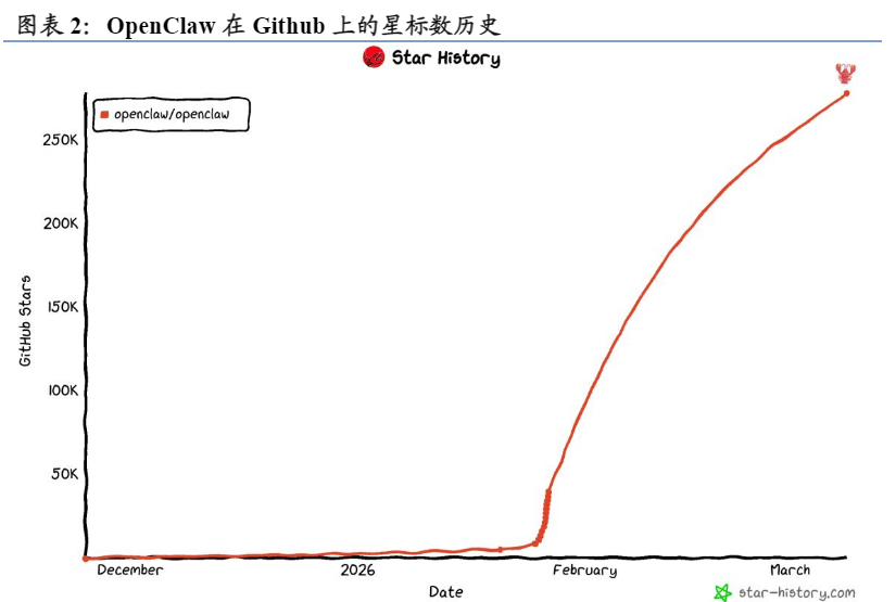 OpenClaw(“龙虾”)为2026年1月开源的一款个人AI助手平台,核心架构由Gateway(网关)、Agent(智能体)、Skills(技能)和Memory(记忆)构成,能运行在用户本地设备及云端,可管理用户的邮箱、日程、自动化任务及浏览网页、执行脚本等,使得大模型从“会聊天的工具”进化为“会做事的系统”,成为用户24小时全天候“AI管家”。OpenClaw于2026.3.1以获得25.2万颗星登顶GitHub软件星标历史第1,并在国内持续出圈。