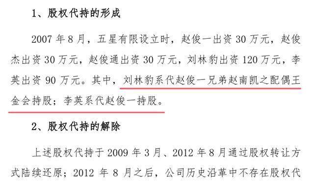 公司历史上存在股权代持情况。2007年8 月,五星有限设立时,赵俊一出资30 万元,赵俊杰出资30万元,赵俊通出资30万元,刘林豹出资120万元,李英出资90万元。其中,刘林豹系代赵俊一兄弟赵南凯之配偶王金会持股;李英系代赵俊一持股。