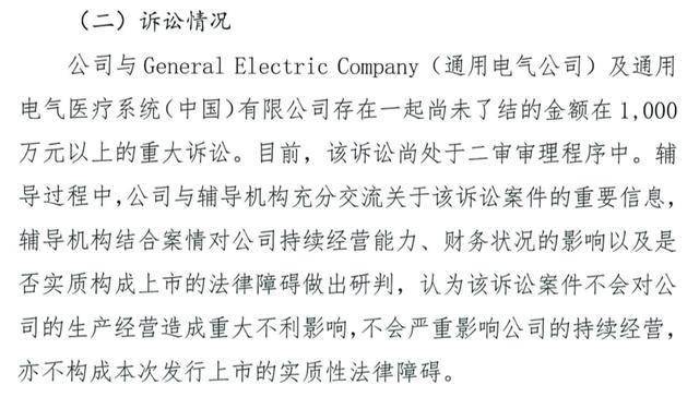 报告显示,公司与General Electric Company(通用电气公司)及通用电气医疗系统(中国)有限公司存在一起尚未了结的金额在1000万元以上的重大诉讼。目前,该诉讼尚处于二审审理程序中。