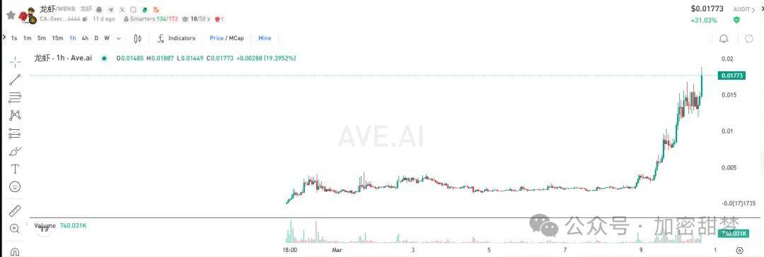 龙虾热度太高了,一天一个高点,马上就要去两千万市值了,已经翻六倍了,十倍币无疑了,到三千w市值就翻十倍了,今年第一个十倍币即将诞生。