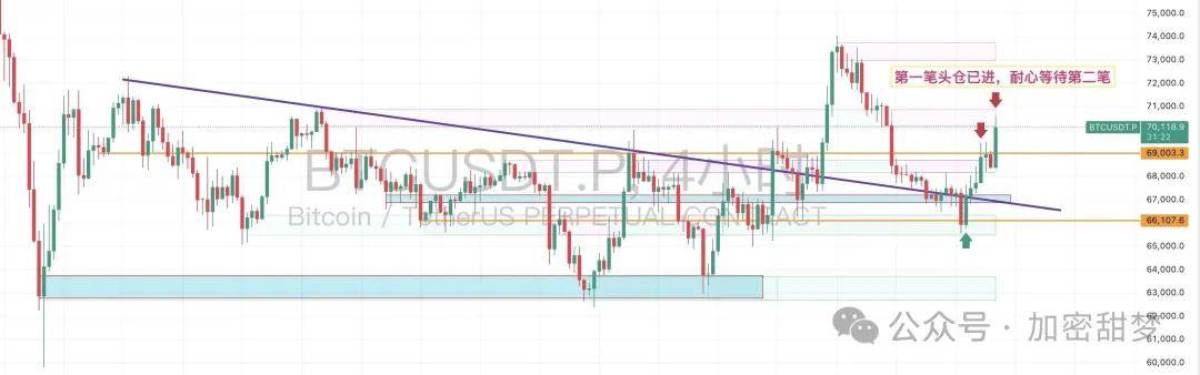 昨天比特币把67600突破了,多头缓了一口气到了7万附近,但这只是反弹,不是新的上涨,现在只是对7万附近的压力测试。