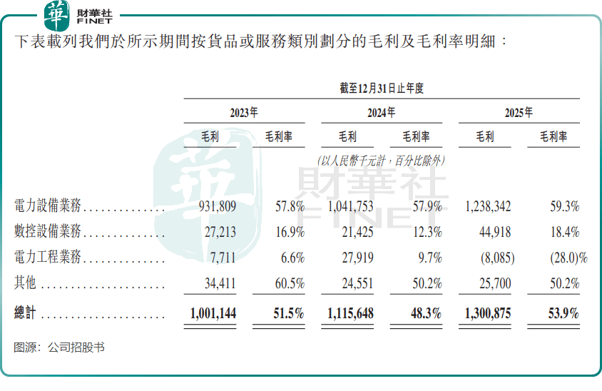 2025年,公司净利润为7.2亿元,毛利率和净利率则分别高达53.9%及29.8%。而根据Wind数据,A股市场的电力设备行业2025年的毛利率均值仅有13.11%,其中宁德时代(300750.SZ)(03750.HK)和大金重工(002487.SZ)毛利率在30%左右,远不及华明装备同期的毛利率。