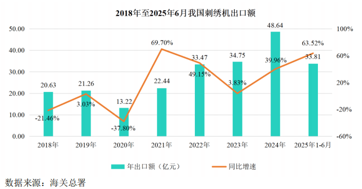 2022年至2025年6月,我国刺绣机出口额分别达到33.47亿元、34.75亿元、48.64亿元和33.81亿元,同比增幅分别为49.15%、3.83%、39.96%和63.52%,出口规模整体保持稳步增长的良好态势。