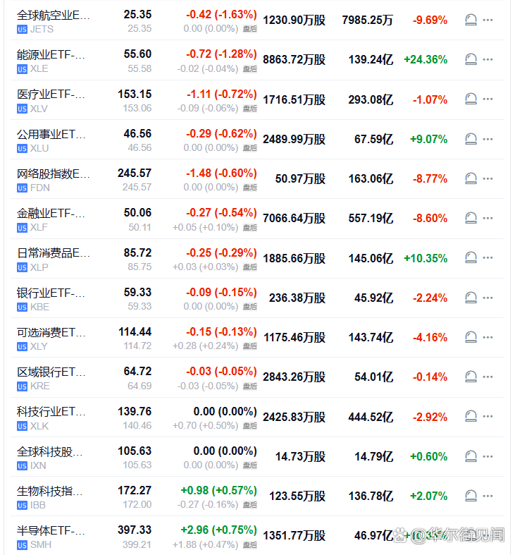【航空业ETF、能源业ETF收跌约1.3%,领跌美股行业ETF】周二(3月10日),全球航空业ETF收跌1.36%,能源业ETF跌1.28%,网络股指数ETF、金融业ETF、银行业ETF、可选消费ETF至多跌0.60%,科技行业ETF、全球科技股指数ETF持平,生物科技指数涨0.57%,半导体ETF涨0.75%。