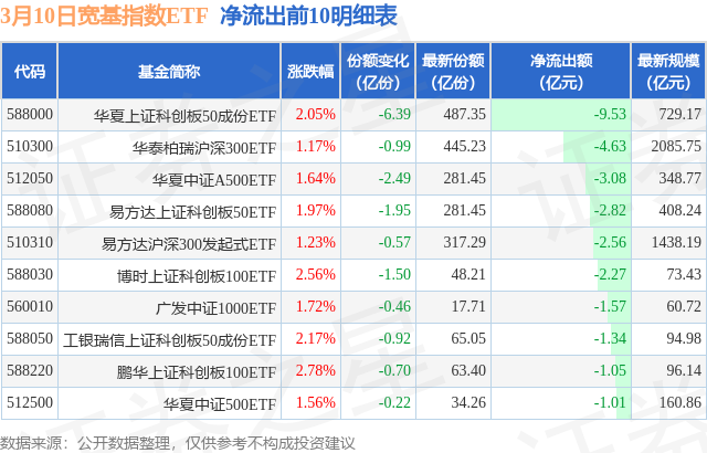 当日有76只宽基指数ETF基金出现资金净流出,其中净流出排首位的是华夏上证科创板50成份ETF(588000),份额减少了6.39亿份,净流出额为9.53亿元。