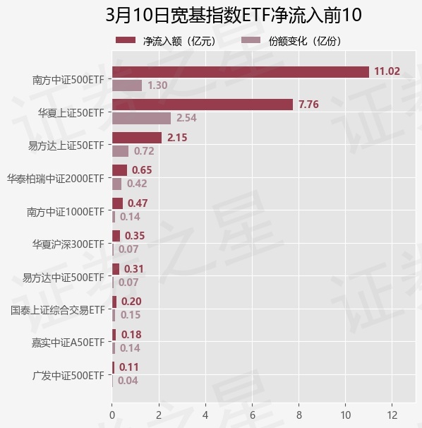 当日有22只宽基指数ETF基金出现资金净流入,其中净流入排首位的是南方中证500ETF(510500),份额增加了1.3亿份,净流入额为11.02亿元。