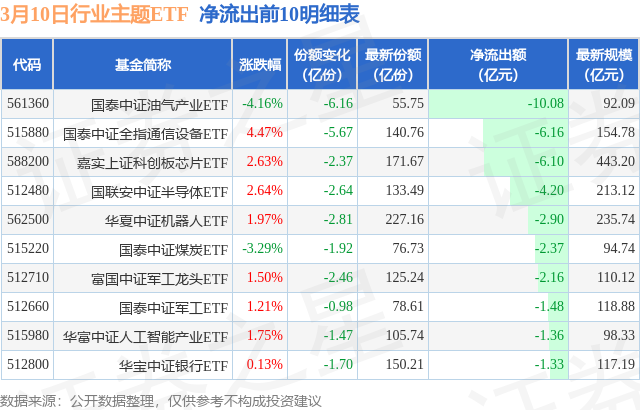 当日有159只行业主题ETF基金出现资金净流出,其中净流出排首位的是国泰中证油气产业ETF(561360),份额减少了6.16亿份,净流出额为10.08亿元。