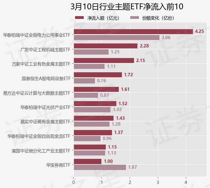 当日有93只行业主题ETF基金出现资金净流入,其中净流入排首位的是华泰柏瑞中证全指电力公用事业ETF(561560),份额增加了3.06亿份,净流入额为4.25亿元。