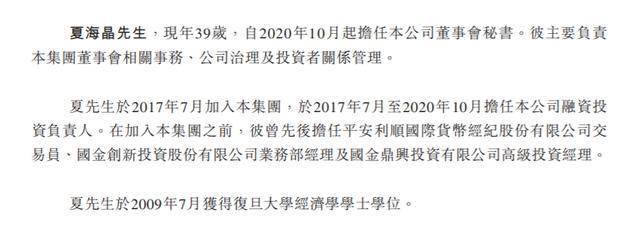 夏海晶,现年39岁,自2020年10月起担任公司董事会秘书。他主要负责本集团董事会相关事务、公司治理及投资者关系管理。