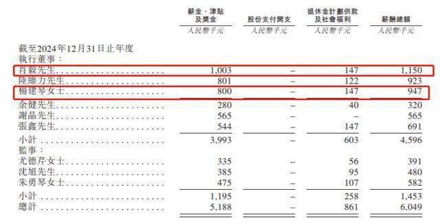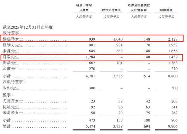 2025年,公司5位执行董事(余健于2025年5月15日停止担任董事)均涨薪。剔除股份支付开支后,肖毅涨薪28.2万元至143.2万元,杨建琴涨薪14万元至108.7万元,陆维力涨薪4.8万元,张鑫涨薪10.2万元,谢晶涨薪9.7万元。