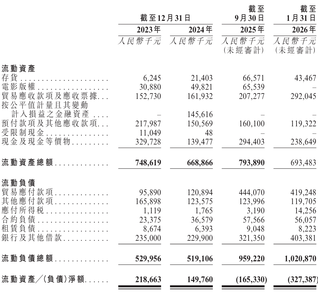 截至2025年9月末,公司现金及现金等价物约2.94亿元,净流动负债1.65亿元。到2026年1月31日,现金余额降至2.39亿元,净流动负债扩大至3.27亿元;一年内到期银行及其他借款4.03亿元,未偿债务总额5.28亿元。毫无疑问,公司面临较大的现金流压力。