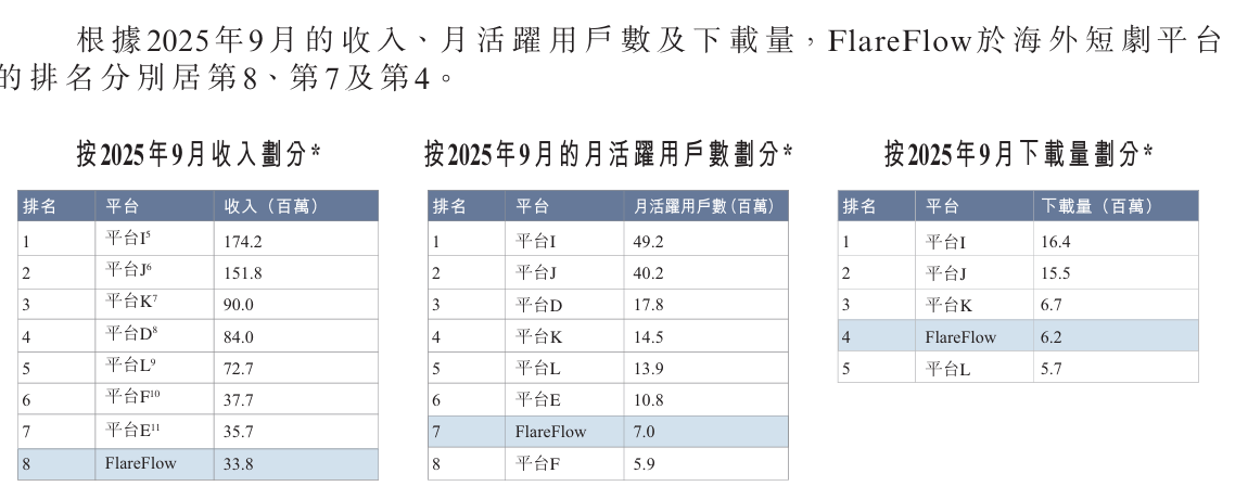 FlareFlow在北美曾登顶部分娱乐应用免费榜,但按2025年9月数据,其收入排名第八,MAU排名第七,与头部平台存在明显差距。